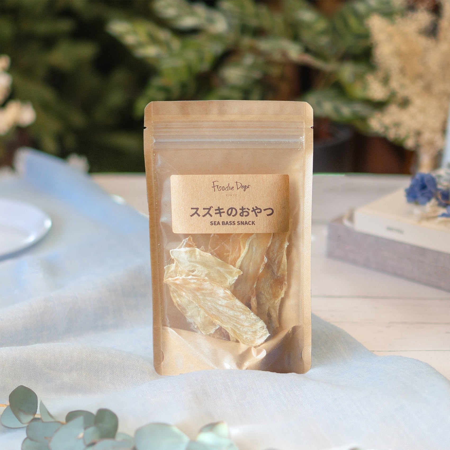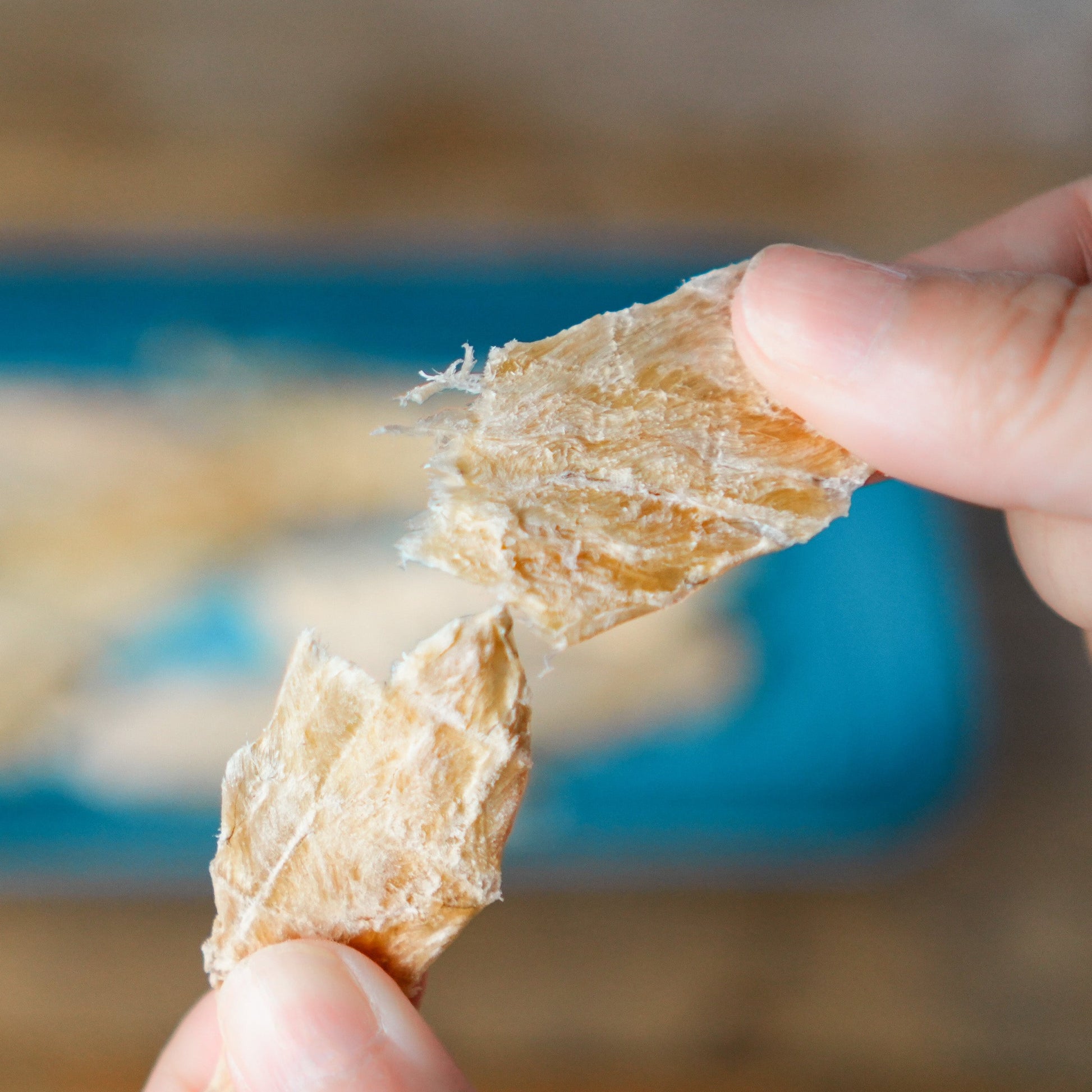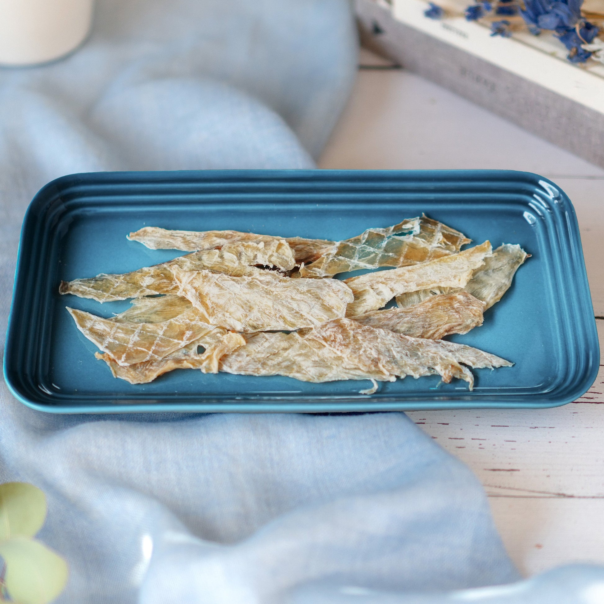 将新鲜鲈鱼切割后,使用特殊的制造方法将其打薄,并进行长时间的干燥处理。它的质地比肉干更轻、更脆,适合小型犬食用。
