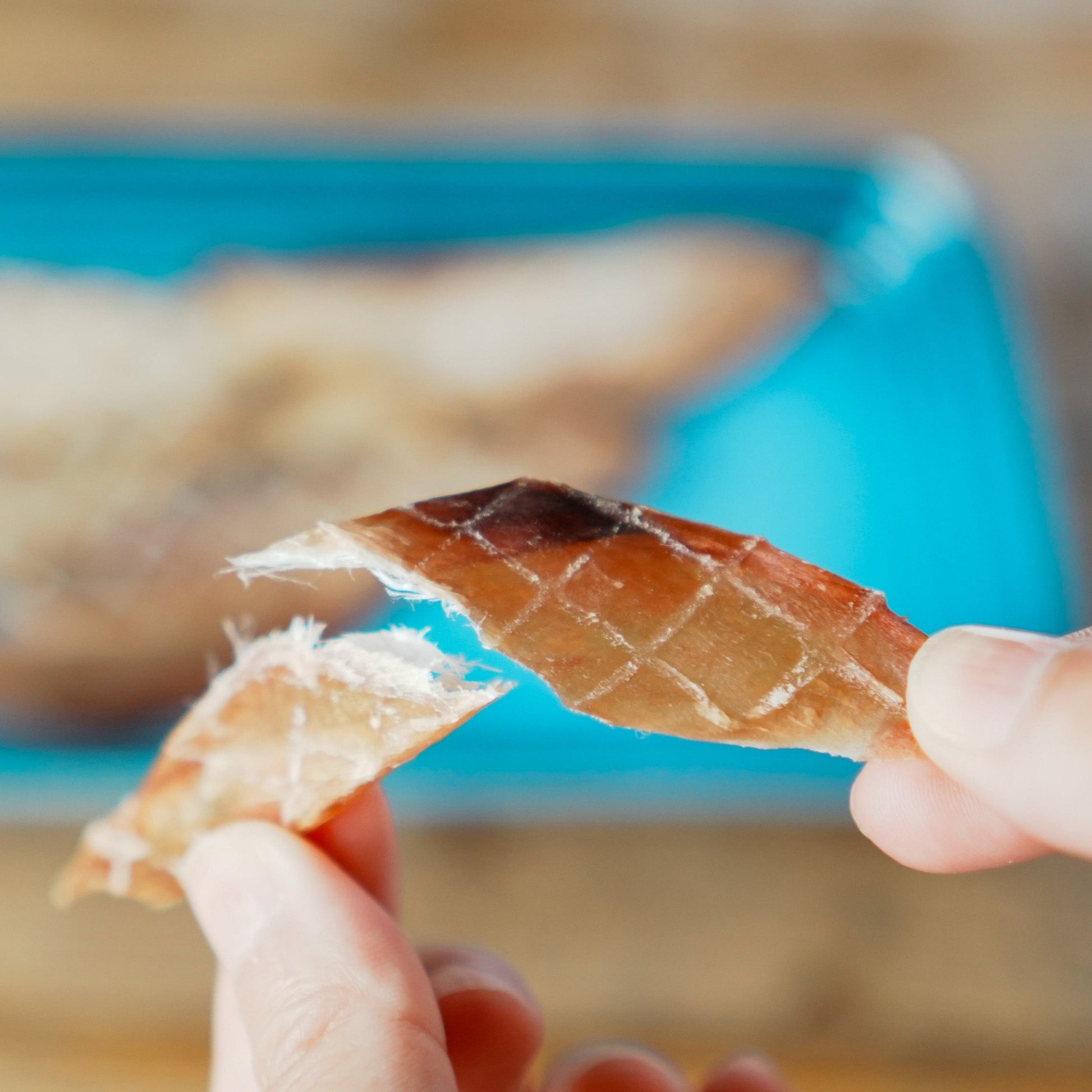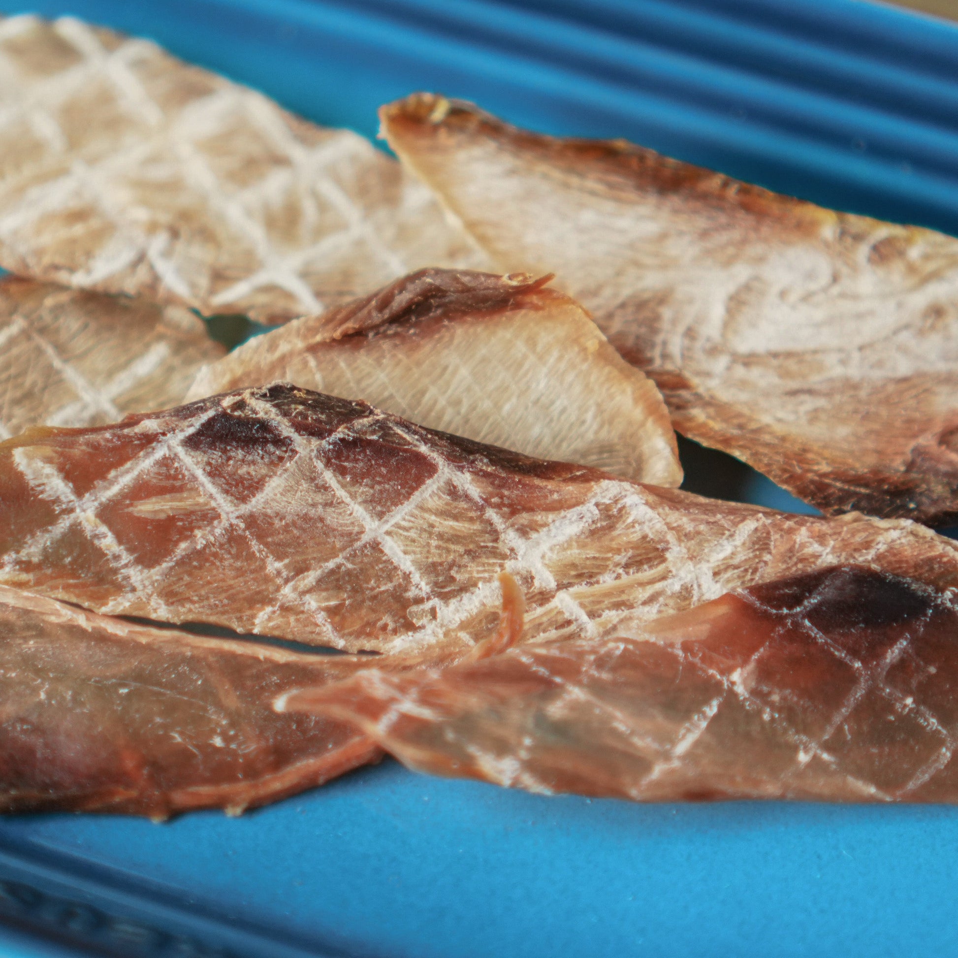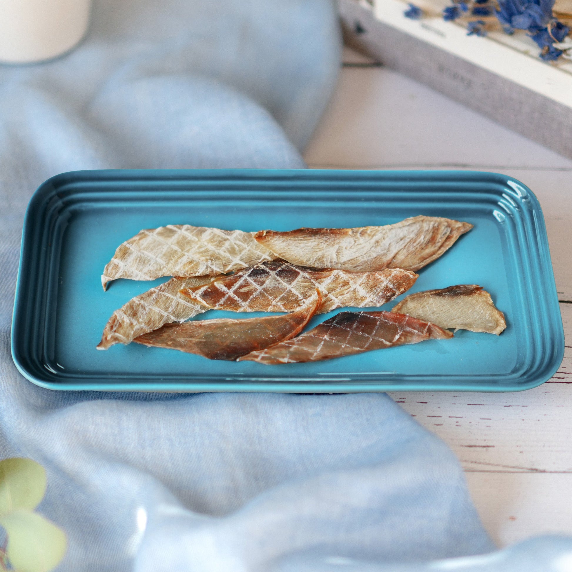 将新鲜的鰤鱼切割后,采用特殊的制造方法将其打薄,并经过长时间的干燥处理。它的质地比肉干更轻、更脆,适合小型犬食用。