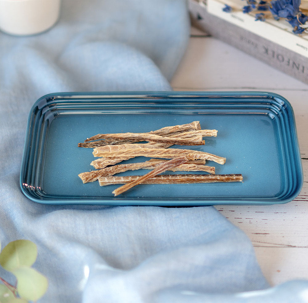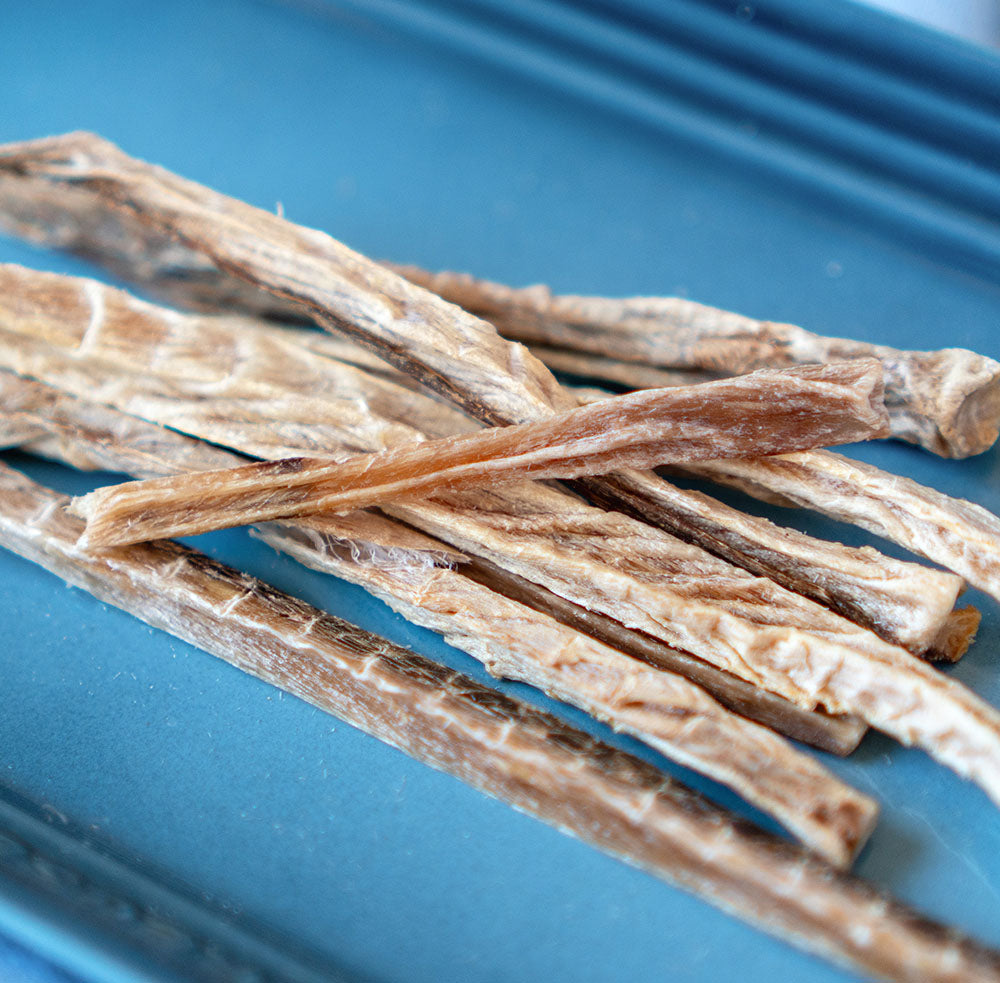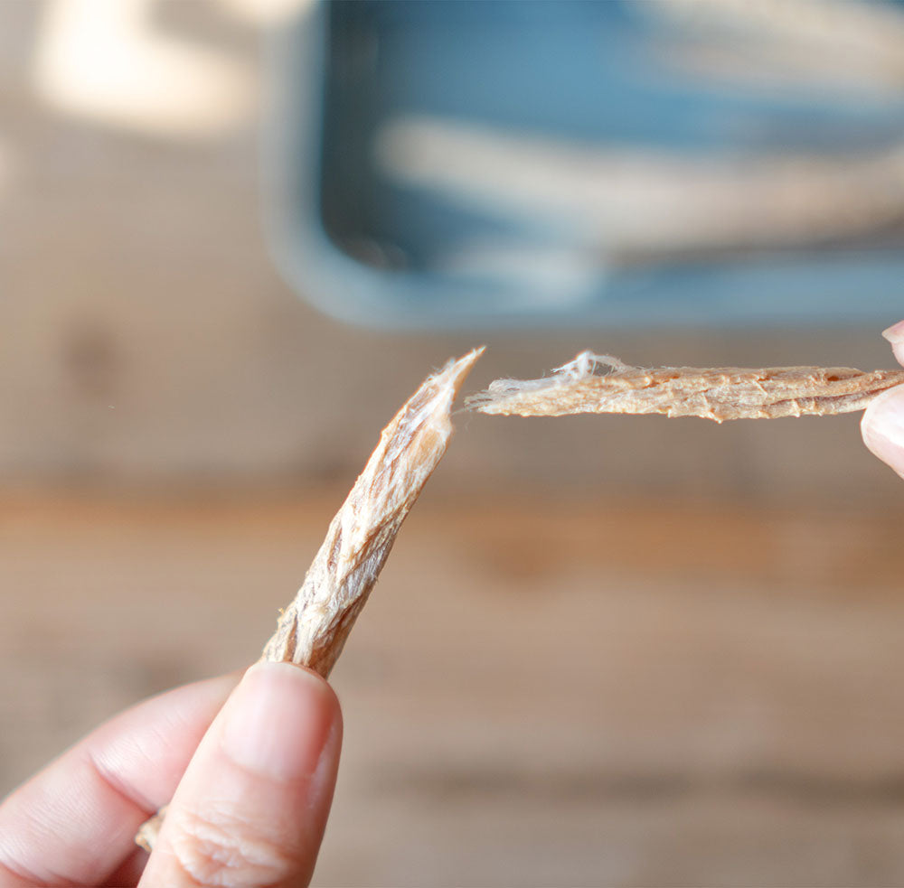 长度刚好适合狗狗用前爪夹着吃的棒状。越嚼,味道就越多。不会太硬,软度恰到好处,即使是小嘴的狗狗也能放心享用。